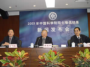 中新网11月24日电 据中国科学院官方网站消息,2003年中国科学院院士增选工作日前结束。今天上午在中国科学院院士学术活动中心召开的增选新闻发布会上,全国人大副委员长、中国科学院院长、中国科学院学部主席团执行主席路甬祥院士宣布,58名科技工作者当选为中国科学院院士。中国科学院副院长陈宜瑜院士宣布了新当选院士名单。