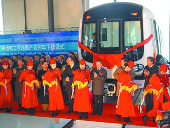 据介绍,2000年8月31日,长春长客——庞巴迪轨道车辆有限公司与广州地铁公司签订了广州地铁二号线26列共156辆地铁客车采购合同,合同总金额15.42亿元人民币。根据合同,前2列共12辆车在德国庞巴迪公司生产,其他24列144辆车在长客——庞巴迪公司生产。到目前,在德国生产的被誉为诚信地铁的首列车已于2002年11月29日由德国空运至广州,长客——庞巴迪公司也因此成为世界商业史上重合同守信誉的典范,第二列车于今年11月中旬由德国运抵广州。
