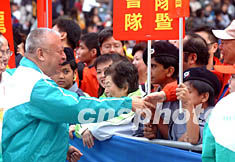2003/2004港岛、九龙区百万行公益金筹款活动十二月七日在香港大球场举行起步礼,香港特别行政区行政长官董建华与参加公益金百万行的民众亲切握手。中新社记者:钱兴强