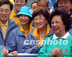 2003/2004港岛、九龙区百万行公益金筹款活动十二月七日在香港大球场举行起步礼,香港特首董建华夫人董赵洪娉兴高采烈与前来参加活动的香港各界知名人士一起合影。中新社记者:钱兴强
