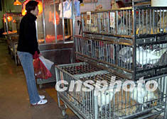 香港长沙湾家禽批发市场,经过农历新年休市三日后,25日早上恢复输入活鸡。由于越南爆发禽流感,食环署在批发、零售等方面,都加强防御措施。图为市民在街市鸡档购买活鸡。作者:谭达明