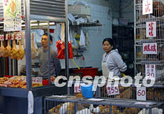 邻近国家相继爆发禽流感后,香港街市鸡档农历正月初三休市清洁。一月二十五日(农历正月初四)开市,至今未发现鸡只有异常情况。图为湾仔街市鸡档生意如常。作者:潘索菲