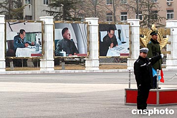 交通警察与解放军空军哨兵三月二日在张贴着毛泽东、邓小平、江泽民大幅照片的北京西郊机场执勤,迎接乘专机抵达北京参加“两会”的委员、代表。中新社记者:张宇