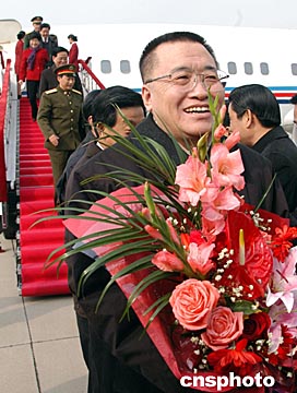 全国人大代表、安徽省省长王金山,三月二日随安徽代表团抵达北京西郊机场时受到热烈欢迎。中新社记者:张宇