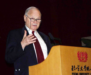 中新网北京3月24日电(何钢 潘旭临)3月22日是“世界水日”,两位在世界环境保护领域的传奇人物——中国全国人大环境资源委员会前主任委员、中华环保基金会理事长曲格平先生和联合国副秘书长兼安南秘书长特别顾问莫里斯·斯特朗先生,受北京大学环境学院和国家环境保护总局宣教中心之邀,于当晚六点三十分,共同出现在北京大学图书馆报告厅,与200多名中外师生见面,畅谈中国和全球环保事业的过去、现在和未来。