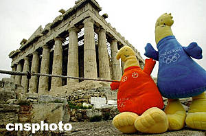 2004年雅典奥运会吉祥物最近亮相,它们是根据古希腊陶土雕塑玩偶“达伊达拉”为原型设计的两个娃娃,长着大脚丫、长长的脖子、小小的脑袋,一个穿着深黄色衣服,一个穿着深蓝色衣服,头和脚为金黄色,十分可爱。它们被命名为“雅典娜”和“费沃斯”,在希腊神话故事中,雅典娜和费沃斯是兄妹俩,雅典娜是智慧女神,希腊首都雅典的名字由此而来,费沃斯则是光明与音乐之神,也就是现在人们所熟知的太阳神阿波罗。Ic/cnsphoto 摄