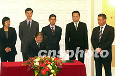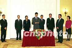 就职仪式今天中午在澳门特区政府总部举行,行政长官何厚铧主持。管委会主席、澳门终审法院法官朱健和检察院助理检察长马翊、初级法院合议庭主席冯文庄、行政暨公职局局长朱伟干、新闻局局长陈致平等四名委员,依次郑重宣誓尽忠职守,然后签署责任状。