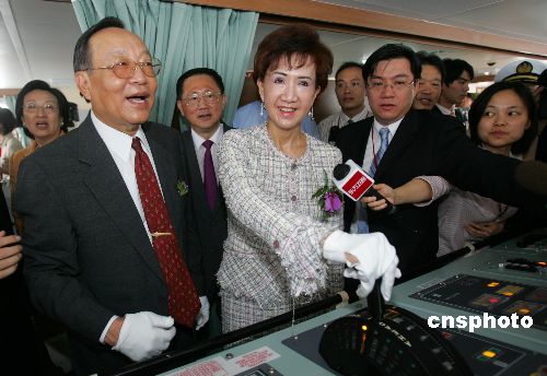 在今天上午命名仪式后,约十一时许连方瑀女士和全国政协副主席董建华先生及“中国航运股份有限公司”董事长彭荫刚先生等一行上船参观,并在船体后侧的驾驶室和彭荫刚先生、以及船长一起为“中华和平”号拉响船笛。