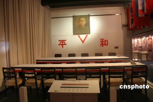 中新社南京八月十五日电(记者 陈光明)以六十年前日军中国战区投降仪式的真实文物组成的历史场景,今天再现南京博物院。