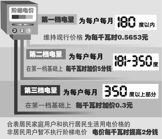 通知要求,电力公司要固定抄表时间,按时抄表。对合表的居民家庭用户,电网企业应制定“一户一表”改造规划,三年内基本完成公用配变供电的合表用户改造。 “一户一表”改造过程中,电网企业不得向居民用户收取电表改造费用。实施阶梯电价后电网企业增加的收入,主要用于弥补发电企业的燃料成本上涨、燃煤机组脱硫等环保成本增加、可再生能源发电补贴、居民用户电表改造等项支出,不得挪作他用。(记者 王恺 通讯员 李峰)