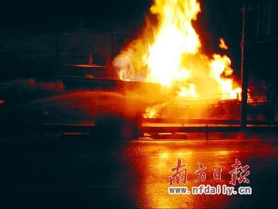 4时45分,厚街中队抵达现场,看到1辆运输货车与前面1辆油罐车发生追尾,货车与油罐车罐体撞击处火势燃烧猛烈,罐体泄漏的甲缩醛引起大面积流淌火。现场官兵迅速展开扑救行动,利用泡沫枪控制火势,并堵截流淌火,防止火势继续蔓延。