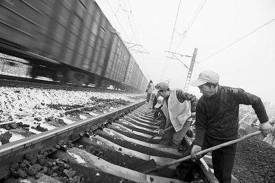 1月21日,中铁七局郑州公司的工程人员在清理准备拨接钢轨内的道砟。 当日,中铁七局郑州公司500多名干部职工在陇海铁路因南水北调工程而改线的路段(关帝庙至荥阳间)进行拨接施工,将陇海铁路上、下行铁路由临时改线段拨接至原既有线段(老段)。至此,南水北调中线总干渠下穿陇海铁路工程已全部完成。 据中铁七局郑州公司介绍,河南段南水北调中线总干渠涉及与京广、陇海、焦枝、宁西等铁路交叉工程共27处,按预定规划,全部工程将在2013年“春运”前全部完成,以确保南水北调工程进度和铁路“春运”运输能力不受影响。 新华社记者 李博摄
