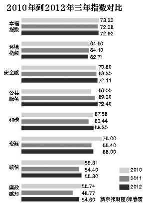 另外,公共服务满意度连年提高,同比增幅达3.1。义务教育、文化娱乐服务和社会保障满意度居前三位,交通服务、医疗卫生满意度偏低。 (记者杜丁)