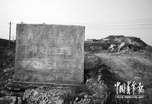 北尖山村内的多处“垫地工程”现场,只有一块块字迹已模糊的“填沟造田工程”牌子和一片片荒地。本报记者 刘星摄