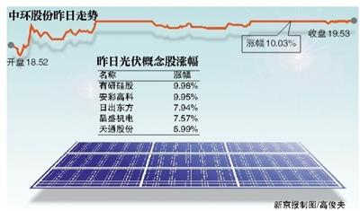 截至昨日收盘,A股太阳能板块平均上涨0.31%。有研硅股、中环股份、安彩高科等涨停,日出东方、晶盛机电、天通股份等涨幅居前。港股方面,保利协鑫能源涨7%,兴业太阳能涨8%。