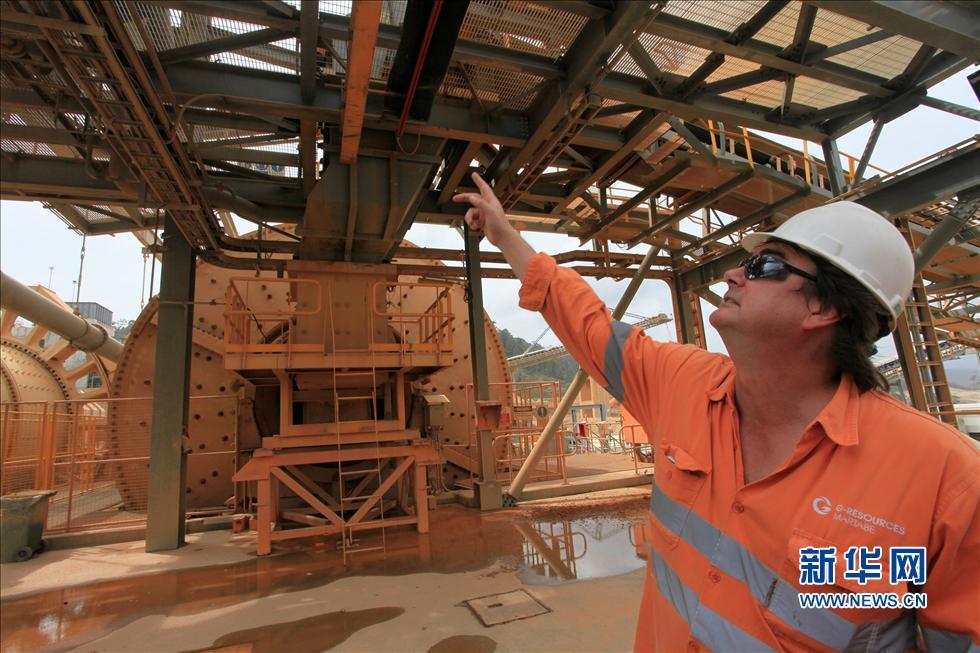 6月15日,在印度尼西亚北苏门答腊省的马塔贝金银矿区,一名工程师介绍矿区的大型矿石球磨设备。新华社记者姜帆摄