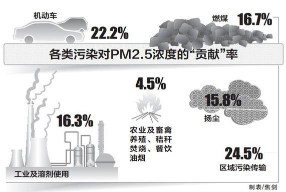 市环保局机动车排放处处长李昆生介绍,通过科研部门的测算,机动车排放的主要污染物分担率比较高,其中一氧化碳分担86%,氮氧化物占57%,碳氢化合物分担38%。从PM2.5的来源上说,机动车尾气排放“贡献”了22.2%。