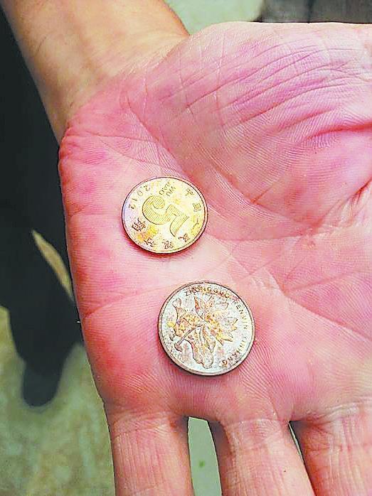 采访中,一位村民从家里拿来了两枚5角的硬币,“你们看看,这硬币一面变成紫色,一面还是原色,刚刚放了一上午就成这样了。”村民怀疑,硬币变色与刺鼻气味有关。