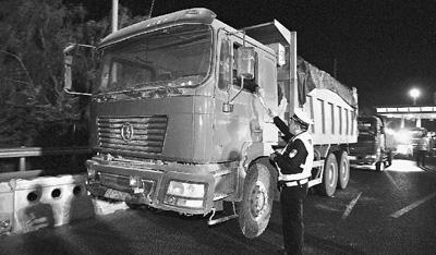 10月10日23时30分,在北京京承高速一收费站出口,交警查扣违规渣土车。