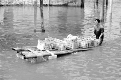 10月10日,在浙江余姚凤山街道,一名村民用自制的筏子运送水果。新华社记者 鞠焕宗 摄
