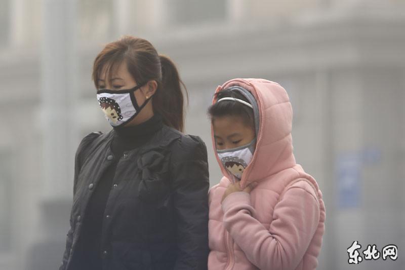 雾霾天气,市民戴口罩出行。东北网记者 王忠岩 摄