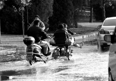 骑车人经过时抬腿躲避积水。京华时报记者陶冉摄/视频