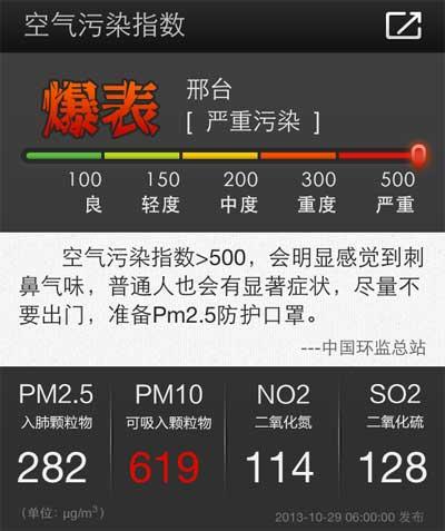 上图为天气通APP上午6时更新的最新空气污染指数数据,邢台PM10指数高达619