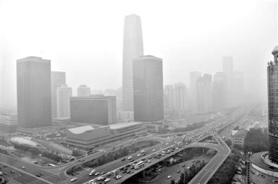 昨日下午,北京东三环国贸桥附近。监测数据显示,前夜至昨日,北京空气质量严重污染。新华社记者 罗晓光 摄