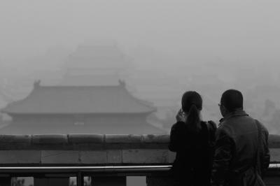 昨天,游客在景山俯瞰故宫。雾霾笼罩,能见度很差。