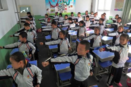 12月11日,河北石家庄光明路小学,全校的孩子都在教室练习一套“防霾”武术健身操。