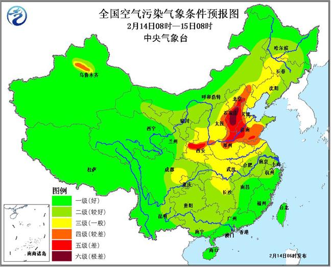 据中央气象台预报,未来三天(2月14日至16日),华北大部、黄淮、陕西关中等地空气污染气象条件差,不利于污染物扩散,上述大部地区有霾,其中,华北中南部、黄淮北部、陕西关中等地的部分地区有中度霾,局地重度霾;今天,上述大部地区气象条件不适宜燃放烟花爆竹。(中新网能源频道)