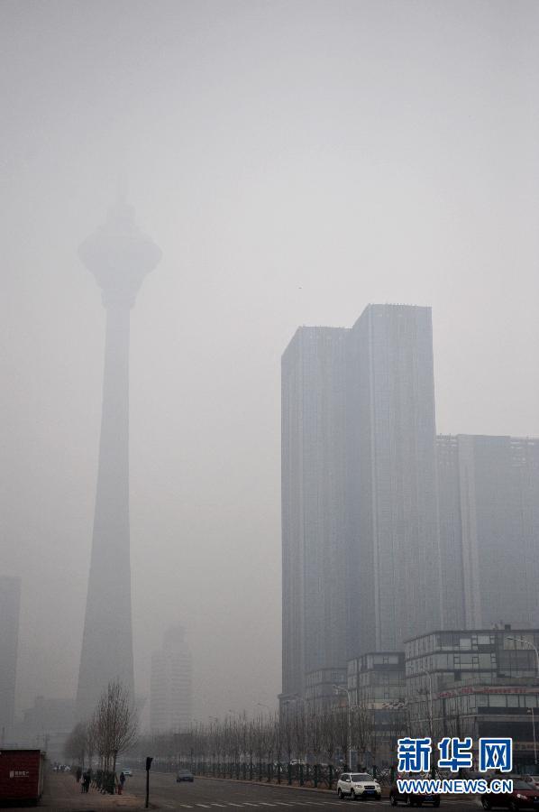 2月23日,雾霾下的天津市广播电视塔(左)隐约可见。中央气象台2月23日06时再次发布霾黄色预警,北京、天津、河北中南部、山东西北部、河南北部、陕西关中地区、山西南部等地气象条件不利于空气中污染物扩散,大部地区有中度霾,京津冀、陕西关中地区的部分地区有重度霾。截止到23日,天津已经连续三日发布霾黄色预警。新华社记者张晨霖摄