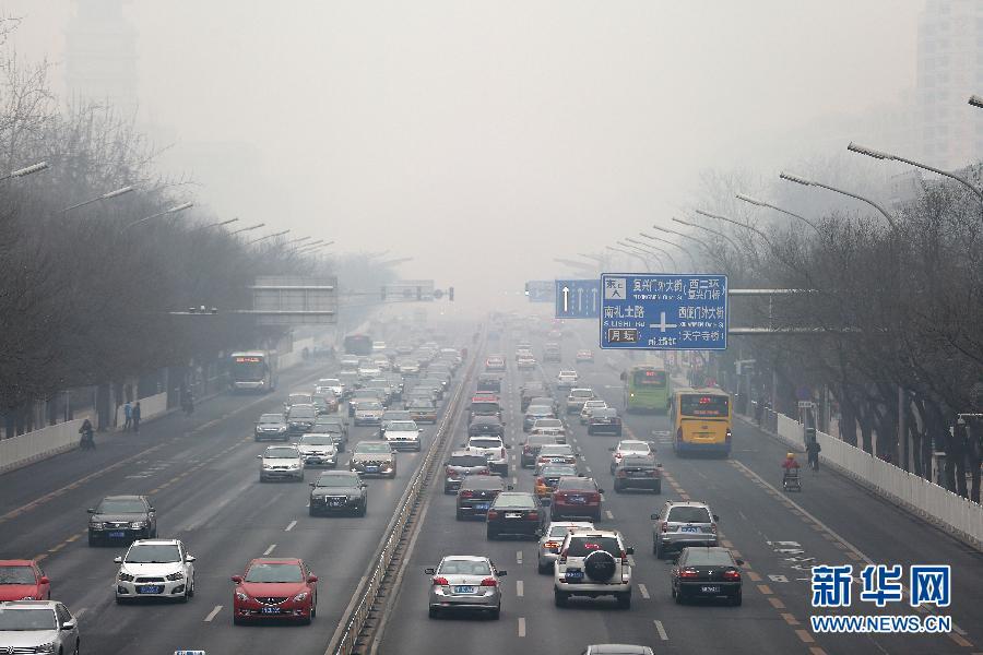 2月23日,车辆在北京长安街上行驶。当日,北京继续发布霾橙色预警信号:预计23日夜间至24日,空气污染气象条件等级为5到6级,不利于污染物的扩散;23日夜间有雾,24日白天有中度到重度霾,提请市民注意防范。新华社记者 金立旺 摄