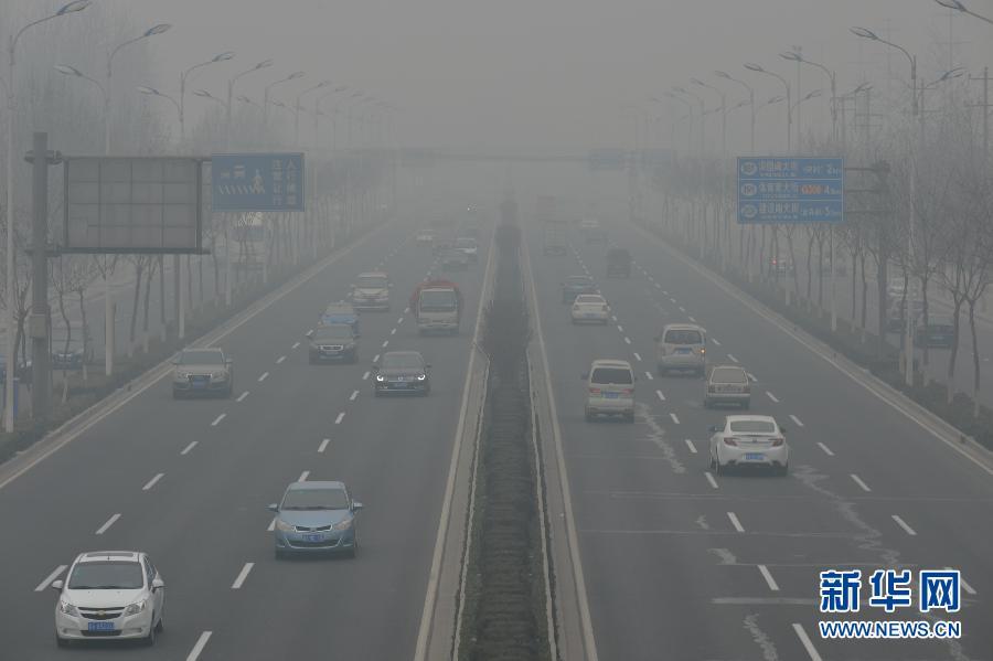 2月23日,机动车在石家庄市东二环主路上行驶。连日来,河北省石家庄市遭受持续性雾霾侵袭,据河北省环境监测中心站通报,未来三天,石家庄将持续出现空气质量指数大于300的严重污染天气。23日零时起,石家庄市启动重污染天气Ⅱ级(橙色)预警应急响应,对部分机动车采取限行措施。新华社记者 朱旭东 摄