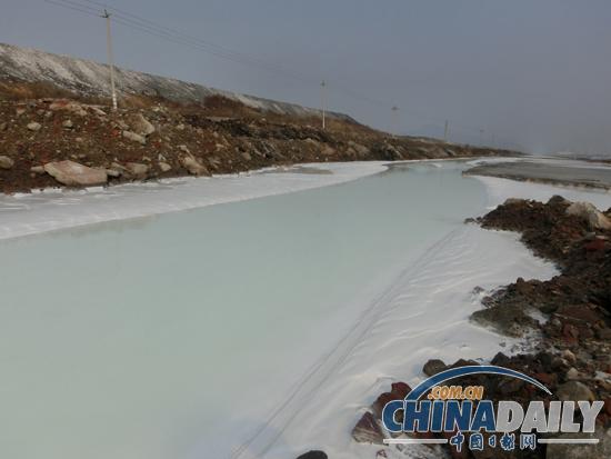 碴场沉淀池护堤不断生长,距排污通道污水面不下10米。排污通道围堰被掘挖加固的痕迹随处可见,有毒废液外溢大港路侧景观河无需想象。