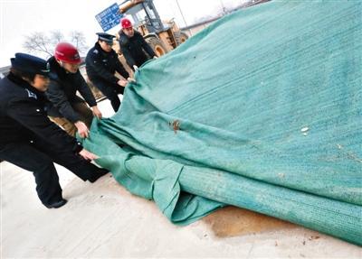 2月21日,执法人员在一处工地内对露天堆放的沙土进行遮盖处理。当天中午,北京市的空气重污染预警级别由黄色上调至橙色。新华社记者 公磊 摄