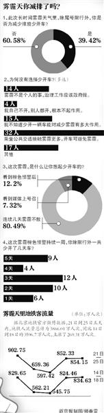 新京报讯截至昨日,此次京城重污染已持续7天。昨日,新京报记者向北京的102名私家车车主发起调查,近四成的车主在雾霾天里为减少排放而少开车。这其中,八成车主是因连续几天雾霾不散而减少开车。
