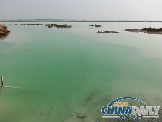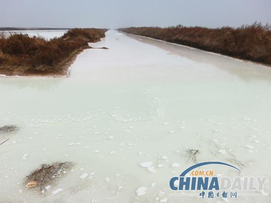 在S242省道北侧,连云港碱厂排放的污水溢满台北盐场湿地。
