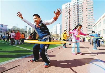 跳绳、呼啦圈、跳格子、打篮球……随着雾霾散尽,昨天上午,本市中小学生纷纷走出教室,来到操场上,呼吸新鲜空气,开展阳光体育锻炼活动。北京朝阳区实验小学一年级学生岳筱涵一来到操场就特别兴奋,“好几天没有这么痛快地玩了,感觉特别舒坦。”