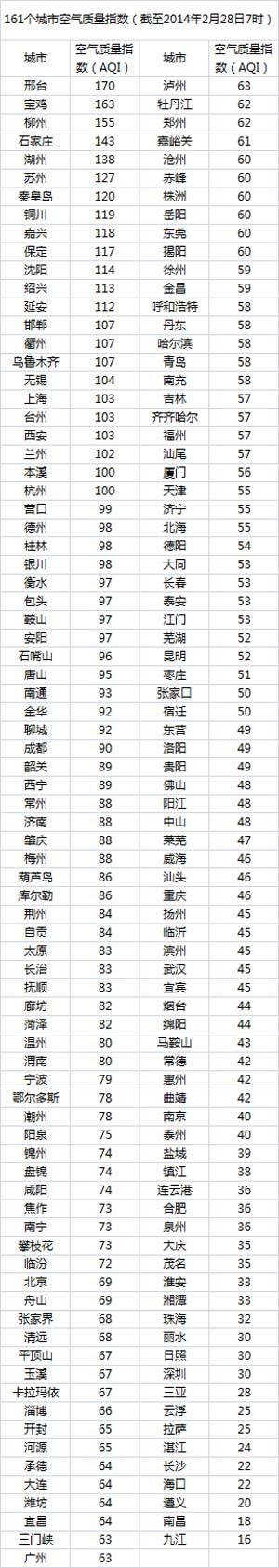说明:自2014年1月1日起,环保部发布空气质量实时信息、空气质量月报及参与空气质量排名的地级城市已由74个增加到161个,包含了直辖市、省会城市、计划单列市、“三区”所有地级城市、环保重点城市和环保模范城市。人民网环保频道将采用环保部的官方数据,对161个城市每日空气质量进行排行。 (杨翼)