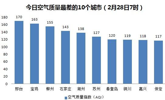 今日全国空气普遍较好,根据环保部公布的最新数据,截至今天早上7时,邢台的AQI(空气质量指数)为170,属于中度污染,成为161个参与空气质量排名的城市中空气质量最差的城市。今日空气质量最差的10个城市分别是邢台、宝鸡、柳州、石家庄、湖州、苏州、秦皇岛、铜川、嘉兴和保定。今日全国无重度及以上污染,仅邢台、宝鸡和柳州等3城市有中度污染。