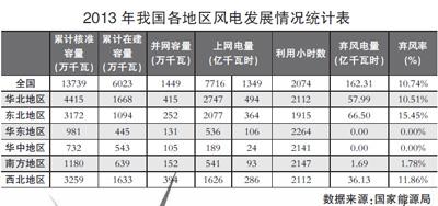 2013年的风电平均弃风率11%,比2012年降低6个百分点。