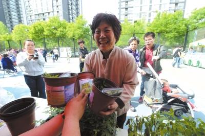 在“变废为绿”活动中,业主用报纸或易拉罐等废品,可以换取一株辣椒苗或香椿苗并获赠有机土壤一袋。活动现场,多名业主拿来家中的废品,换回盆栽的树苗。