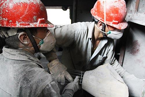 2014年,浙江省20%燃煤电厂启动实施燃煤电厂脱硫脱硝及除尘技术设备改造。浙江巨化集团投资超过3亿元,计划历时一年,对热电厂4台在用锅炉机组进行脱硫脱硝等提标技改。图为检修人员正在更换布袋除尘设施。 李钱乾摄