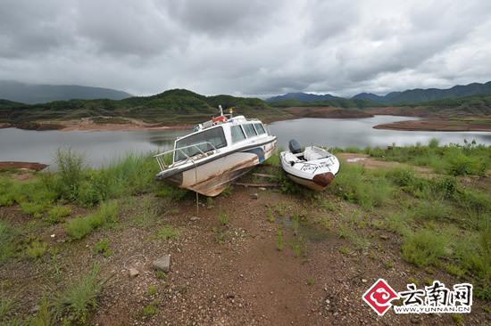 站在云龙水库的大坝高处才能看到残留在库底的一点水以及光秃秃的小岛。大坝的一侧,一条船摆放在半山腰。云龙水库管理处运行管理科詹书平说,原来船是放在岸边的,是水库里的管理使用船只。往上游走,库底都露在了外面,原本淹没在水中的云龙乡旧址也呈现出来。