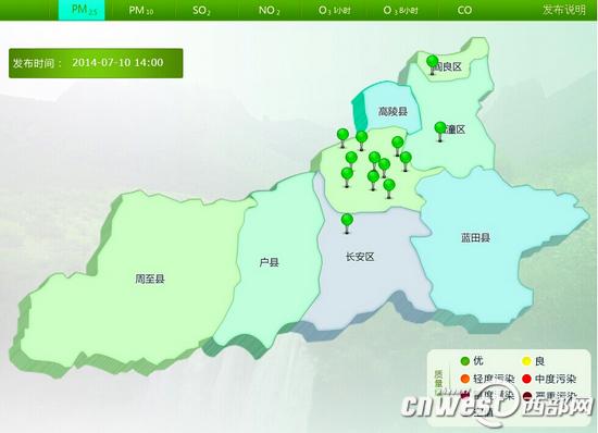 (7月10日)下午2时,西安空气质量显示为“优”,监测点全部“飘绿”。