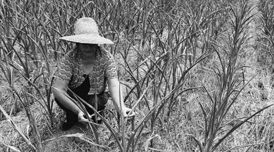 28日,河南省温县温泉镇东梁所村村民在一块受旱的玉米田里查看苗情。