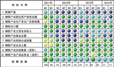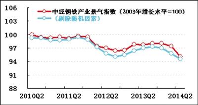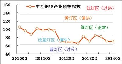 2014年二季度,中经钢铁产业景气指数为95.0,比上季度下降2.3点;中经钢铁产业预警指数为70.7,与上季度持平,仍然在“浅蓝灯区”下临界线附近运行。