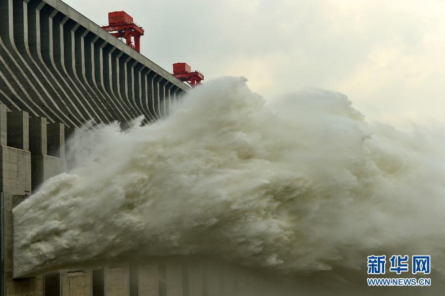 9月14日,江水通过三峡大坝泄洪深孔下泄。三峡枢纽即将启动新一轮175米试验性蓄水之际,迎来了新一轮洪水过境。14日14时,三峡枢纽的入库流量已达44500立方米每秒,水库水位创今年汛期新高,为此,三峡大坝开启泄洪深孔泄洪。按照国家防汛抗旱总指挥部的批复,三峡枢纽工程将于9月15日启动新一轮175米试验性蓄水。 新华社发(郑家裕 摄)