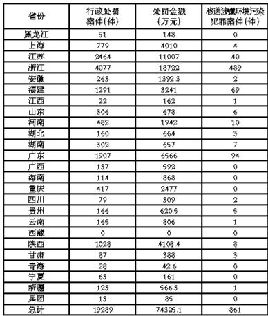 这位负责人指出,今年上半年,各地查处环境违法行为的力度不断加大,环境行政处罚工作取得了良好的成效。全国共处罚环境违法案件19289件,处罚金额74325.1万元,北京、河北、上海、江苏、浙江、福建、广东、陕西等省(市)工作较为突出。